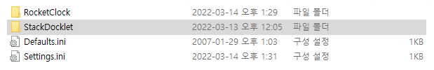 (RocketDock 설정은 .INI파일에 저장하지 않아도 레지스트리에서 대부분의 설정을 기억하고 있지만 StackDocklet 등 모든 기능을 제대로 쓰려면 Settings.ini 파일이 생성되는 것을 추천)