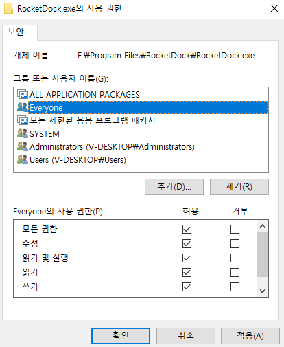 1. 속성 - 보안 탭 - 편집 - User (xxxxxxxxxx\Users) 선택 - 아래쪽의 Users의 사용 권한에서 모든 권한 체크 - 적용 - 확인